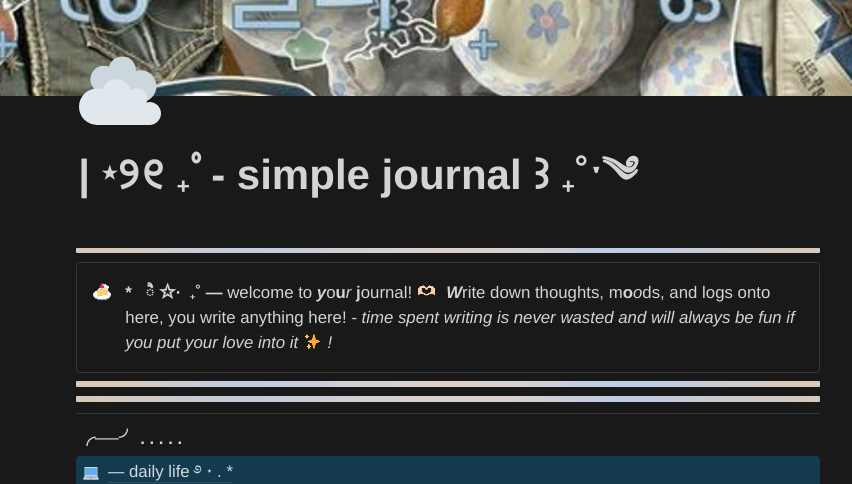 Write down thoughts, moods, and logs onto here, you write anything here! - time spent writing is never wasted and will always be fun if you put your love into it ✨ !